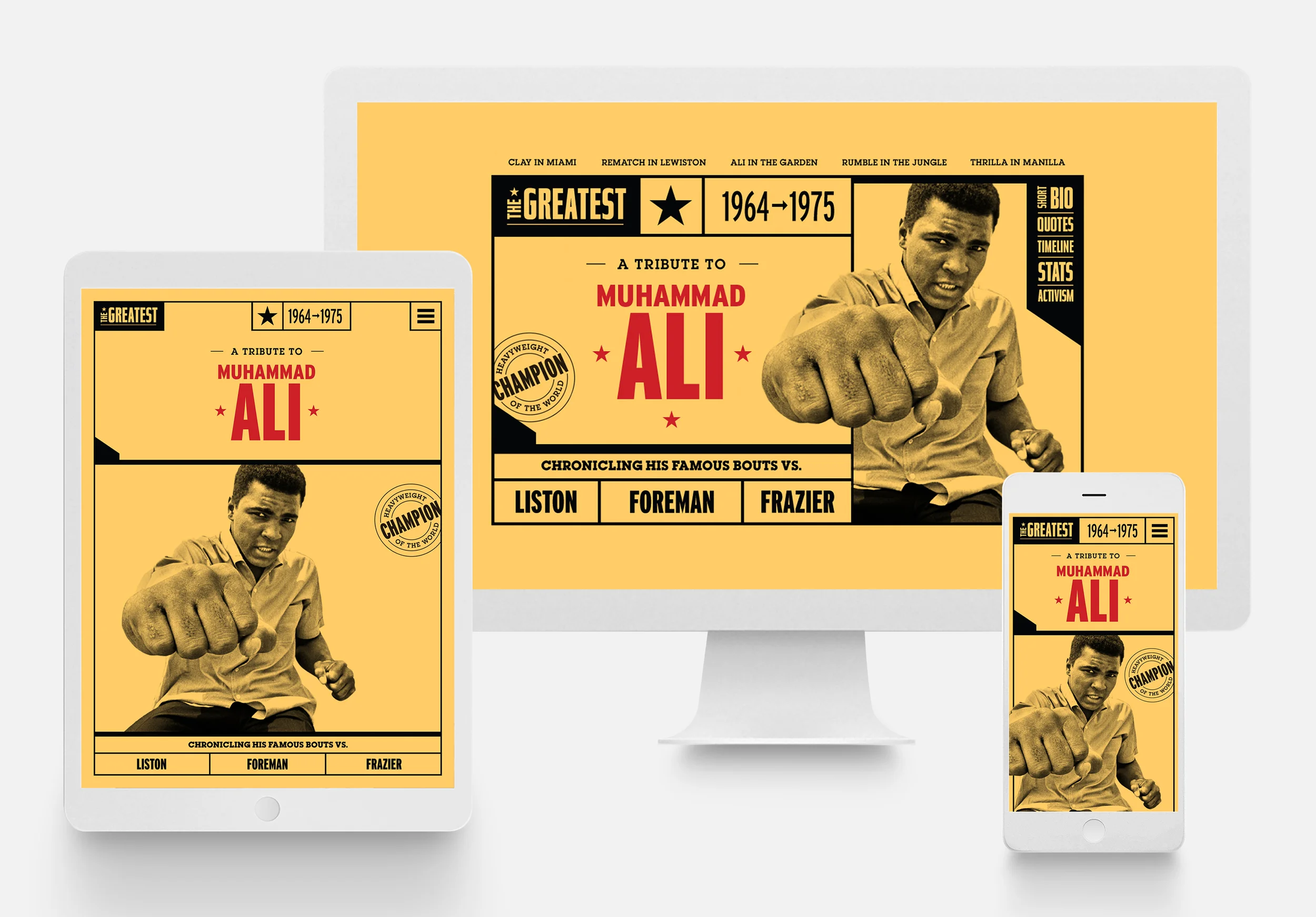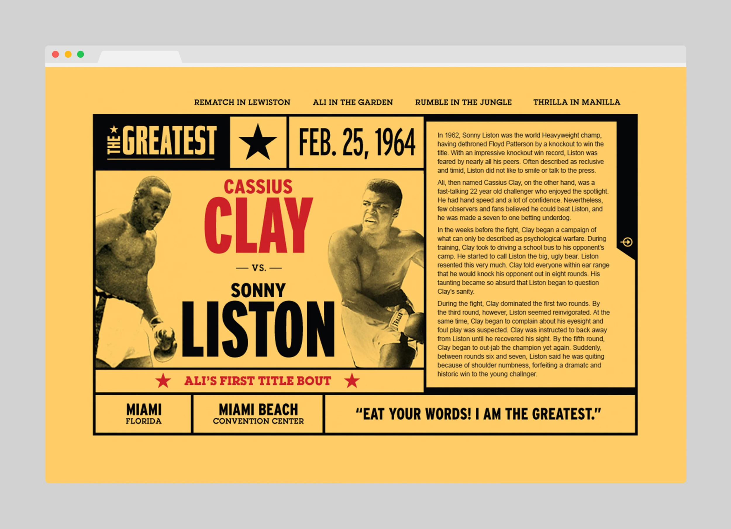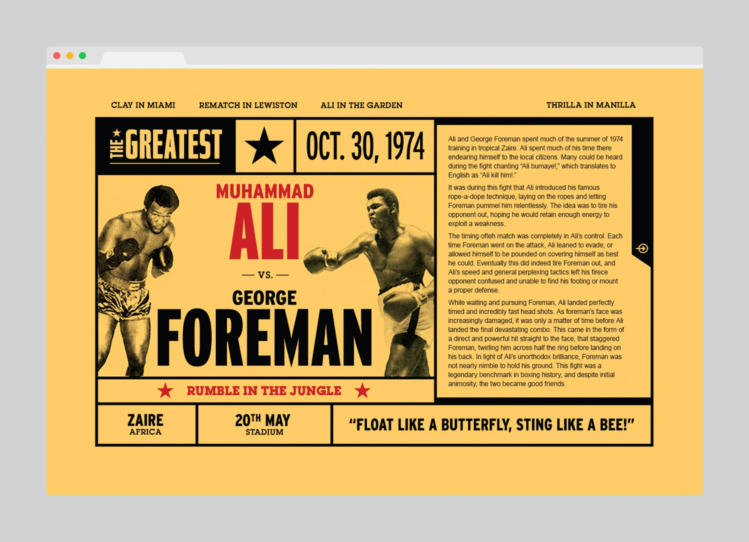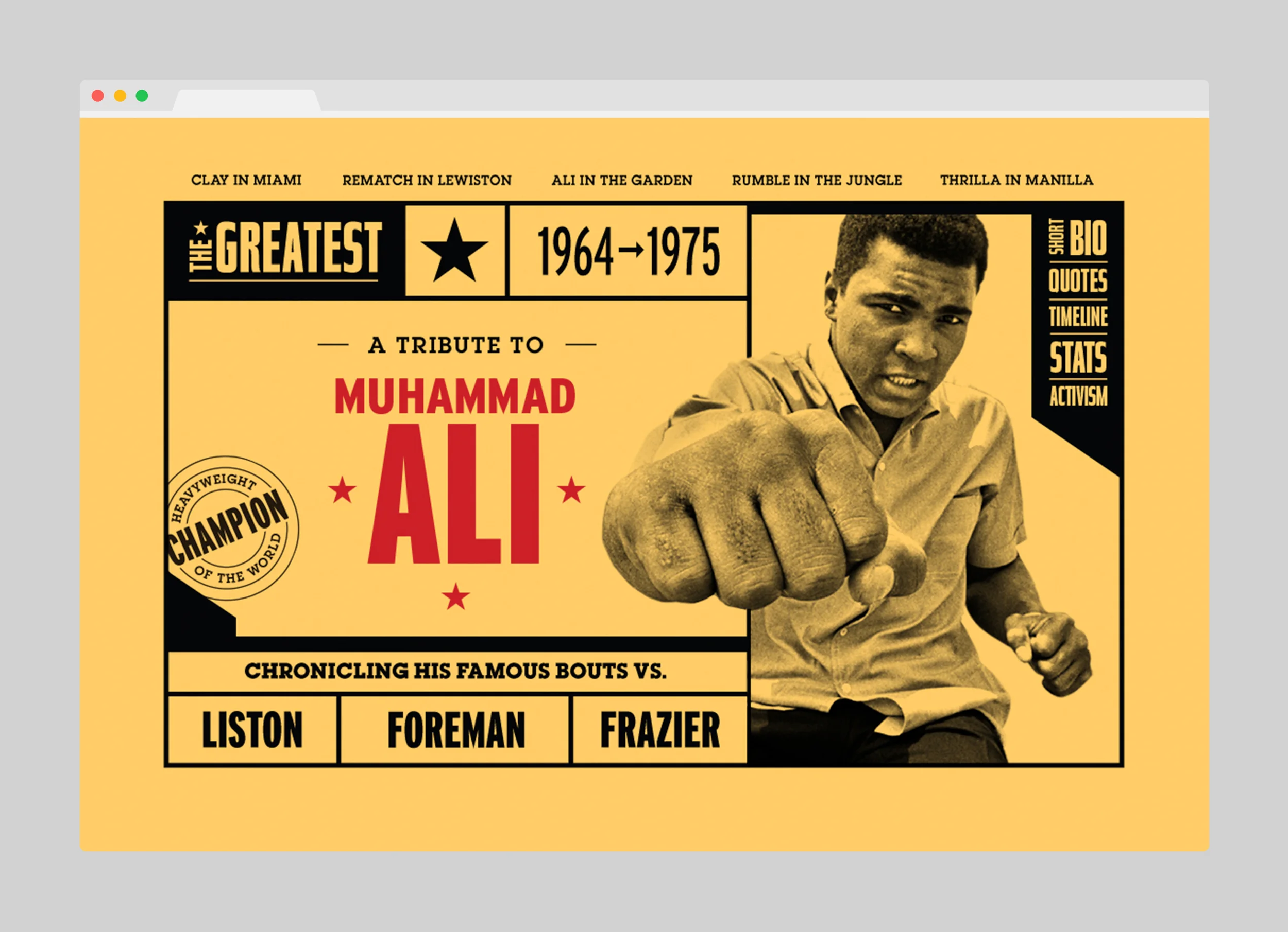 Tribute to Muhammad Ali, three-time Heavyweight Champion of the World, social and political force of nature, and life-long advocate for global peace. This responsive site focuses on the five most exciting fights of his boxing career, and is designed in the style of a vintage fight poster brought into the digital age.